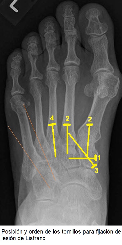 - Uno de los tratamientos más indicado para las lesiones de Lisfranc es la reducción abierta y fijación interna con tornillos de cortical de 3,5mm.